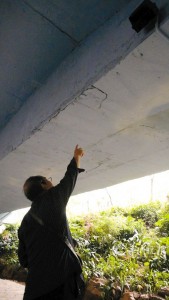 昨日,經(jīng)街坊指引,記者在東濠涌高架橋越秀北路至豪賢路段的橋底下,看到了街坊們所說(shuō)的一道道黑色蟻路,有的在橋底中央,有的在橋墩與箱梁的交接處,有的處在橋底的邊緣。“這些是明顯的蟻路,有時(shí)從下面經(jīng)過(guò),還會(huì)掉些碎土下來(lái)。”街坊薛伯十分肯定地說(shuō)。不過(guò),由于距離有點(diǎn)遠(yuǎn),這些“蟻路”看起來(lái)就像是一道道裂縫(見(jiàn)左圖),“如果是裂縫,恐怕問(wèn)題更加嚴(yán)重”。